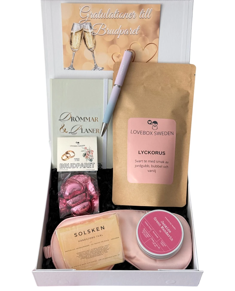 Ibland väljer brudpar att avstå från traditionella önskelistor. Men att komma helt tomhänt känns sällan rätt. En presentbox fylld med upplevelser för sinnena – som doften av mandarin, lyxig choklad och en bok för gemensamma planer – är aldrig fel. Det är inte bara saker, det är en omtänksam gest som uppmuntrar paret att ta hand om varandra i sin nya tillvaro som äkta makar.