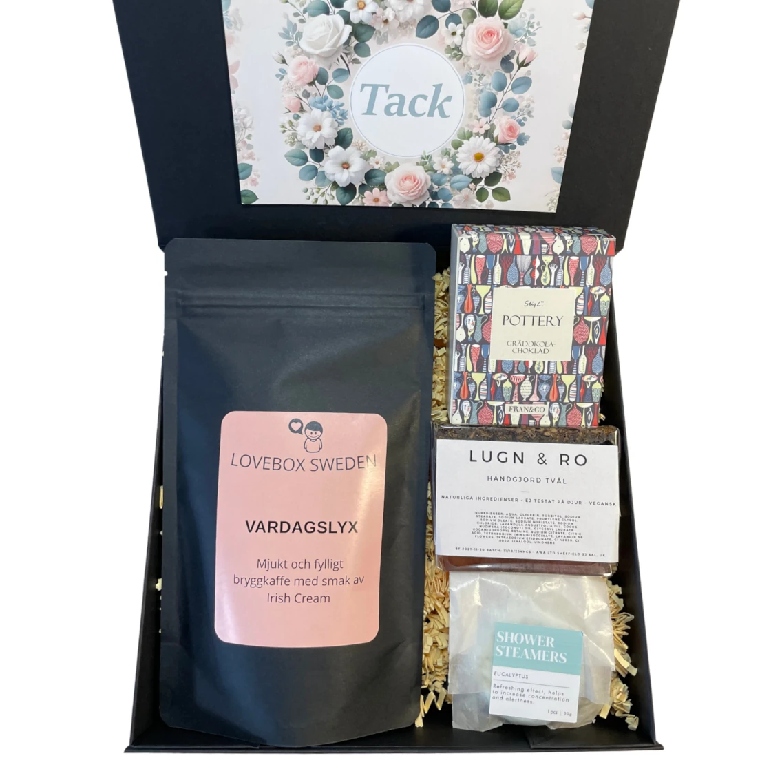 Ibland räcker ett vanligt "tack" inte till. Tackpresent Kaffe är den perfekta gåvan när du vill ge bort något som verkligen doftar, smakar och känns. Denna box är skapad för att ge mottagaren en välförtjänt paus, där en god kopp kaffe möter lugnet av ett eget hemmaspa.