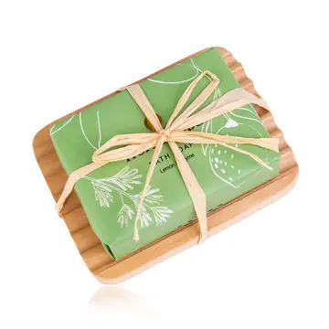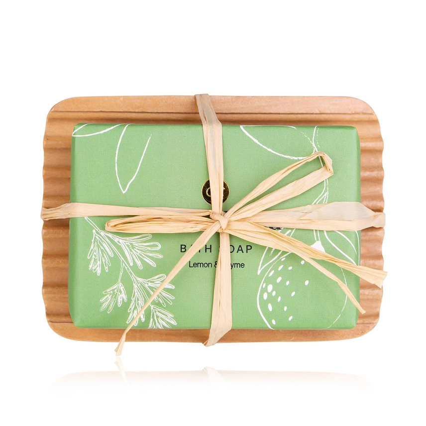 Ge handfatet en naturlig och stilren uppdatering med detta eleganta handvårdsset. Du får en generös, vackert inslagen hårdtvål (100g) som vilar på ett rustikt tvålfat av äkta trä.